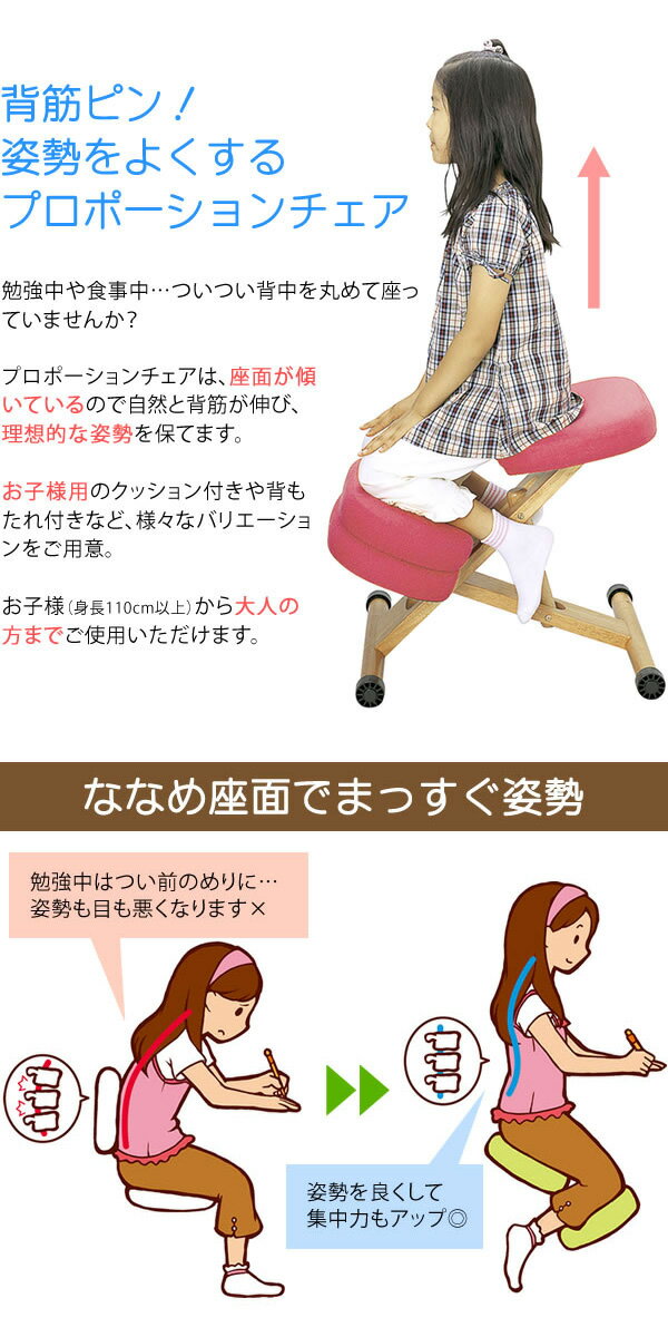 勉強中や食事中…ついつい背中を丸めて座っていませんか? プロポーションチェアは、座面が傾いているので自然と背筋が伸び、理想的な姿勢を保てます。