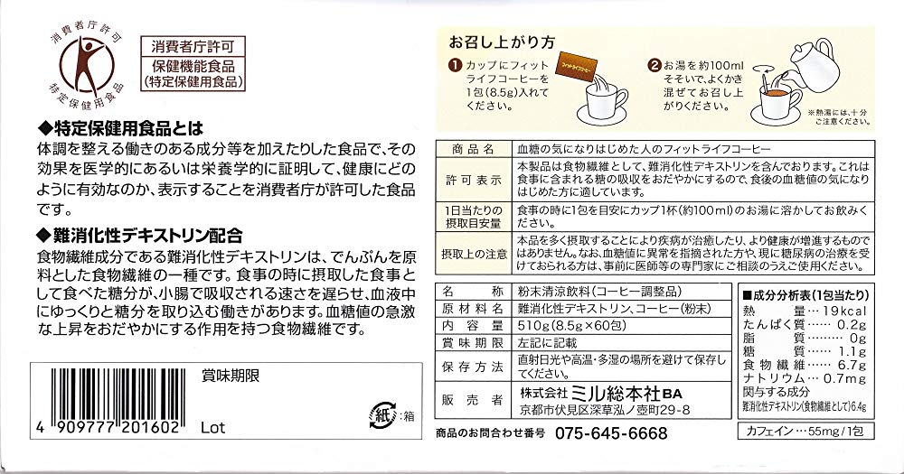 商品情報 商品の説明 ミル総本社の特定保健用食品 フィットライフコーヒー (8.5g×60包)飲んで食後の血糖値の上昇をおだやかにするコーヒー血糖の気になりはじめた人におすすめの食物繊維(難消化性デキストリン)配合のブレンドコーヒーです。